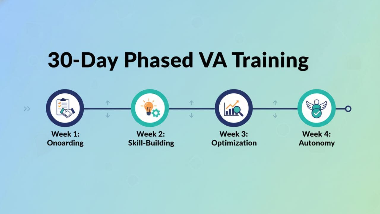 Initial training should be founder-led for your first VA to ensure quality and alignment. Once your first VA is fully trained (typically within 6–9 months), you can delegate training to them using documented SOPsβ€”freeing up nearly 70% of your training time.