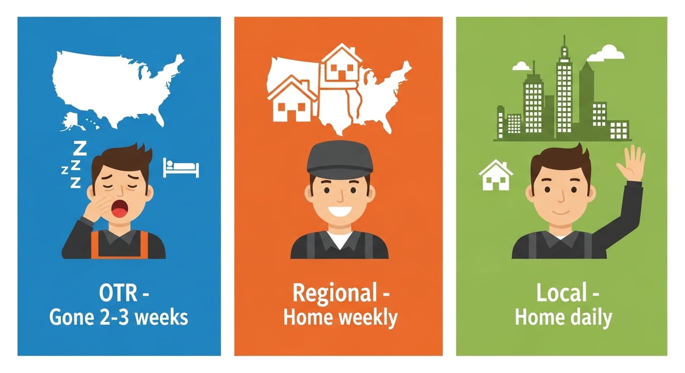 The key difference from local: You are not driving a dump truck or delivery van home every night. You are still sleeping in a sleeper cab a few nights per week.