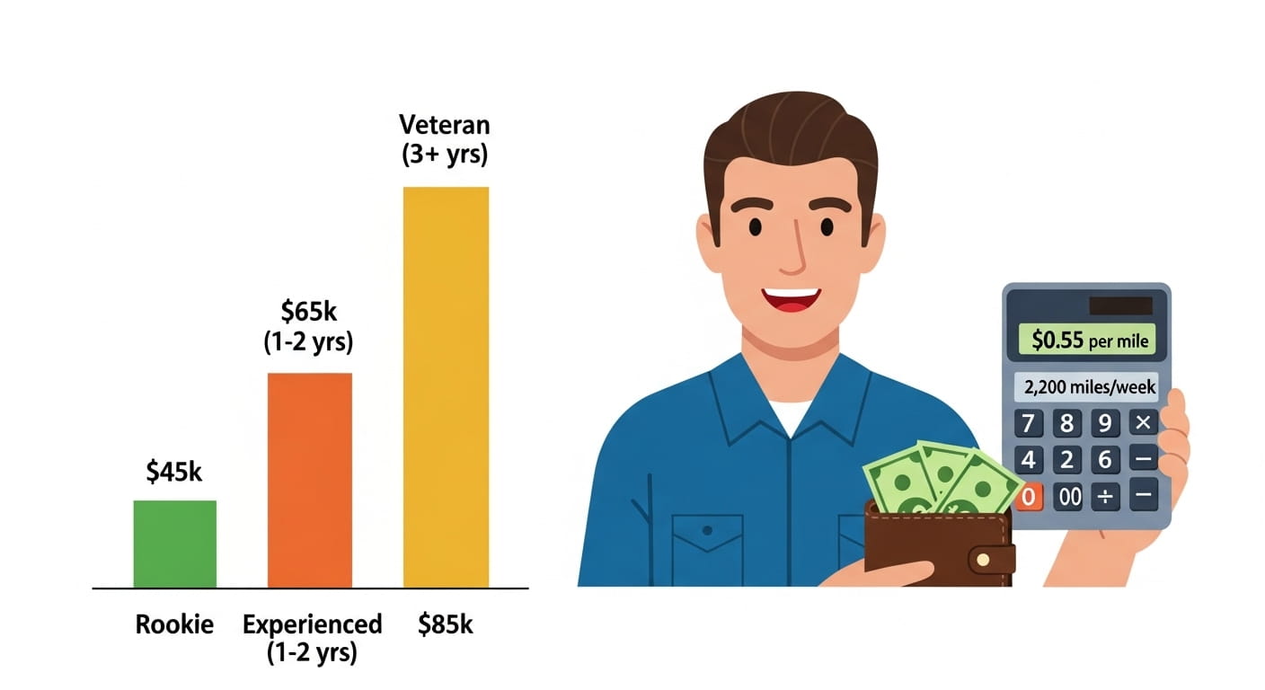 Experience Pay Per Mile Weekly Miles Weekly Pay Yearly Estimate Rookie (0-6 mo) $0.42 – $0.48 1,800 – 2,000 $750 – $960 $39k – $50k Experienced (1-2 yrs) $0.50 – $0.58 2,000 – 2,400 $1,000 – $1,400 $52k – $73k Veteran (3+ yrs) $0.60 – $0.70+ 2,200 – 2,600 $1,300 – $1,800 $68k – $94k Note: Some regional carriers pay hourly ($24–$30/hour) plus overtime. Others pay a daily rate. Always ask: What is the average weekly gross for a driver on this regional account?