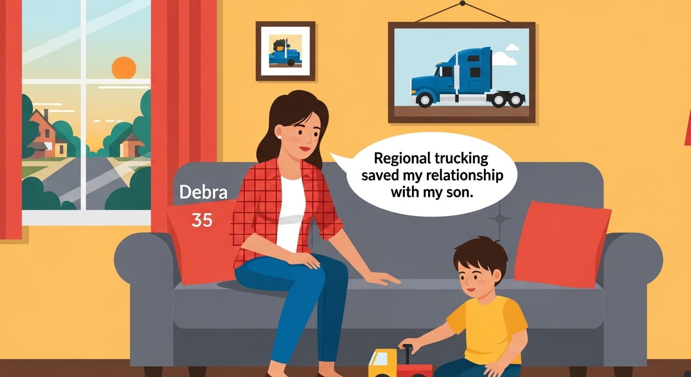 So Debra switched carriers. She now runs a dedicated regional lane: Ohio, Pennsylvania, West Virginia, and Kentucky. She drives about 2,100 miles a week. She leaves Monday at 6 AM, returns Thursday night. She has Friday, Saturday, and Sunday with her son.